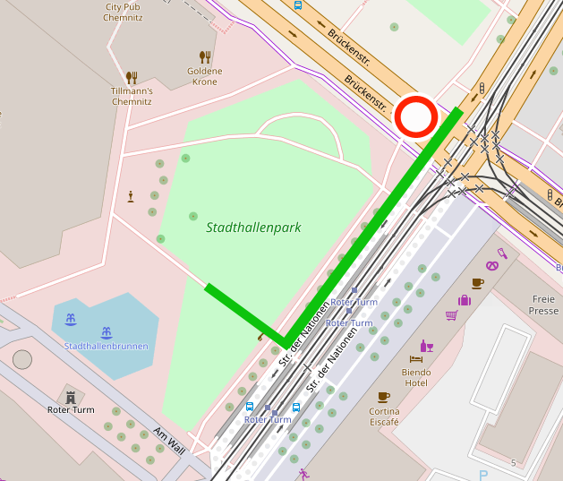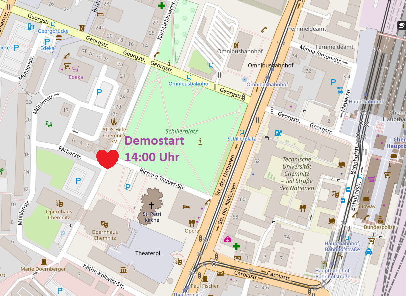 Liebe Akteur*innen, hier kommen die letzten Infos zum CSD Chemnitz. Für Teilnehmer*innen an der Demonstration: Aufgrund der Baustellensituation starten wir dieses Jahr ein paar Meter versetzt. Bitte beachtet die beigefügten Grafiken des Startpunktes und der Auftaktroute. Der Streckenverlauf dieses Jahr: Richard-Tauber-Str./StraNa/Georgstr. bis Hbf - 5min Zwischenkundgebung - weiter Bahnhofstraße über Zenti und Falkeplatz/Theaterstr./Mühlenstr./Georgstr./StraNa bis Stadthallenpark Der Bahnsteig 1(Busspur Richtung Zentralhaltestelle) am Roten Turm wird von der CVAG nicht bedient, dieser wird zur Ankunft der Demonstration dazu genutzt, Leute absteigen zu lassen, die teilnehmenden Fahrzeuge soweit abzubauen, dass diese am normalen Straßenverkehr teilnehmen können, anschließend wenden die Fahrzeuge am Johannisplatz und verlassen den Bereich. Für Teilnehmer*innen am Straßenfest: Die Zufahrt ist nur über Bahnsteig 1(Busspur Richtung Zentralhaltestelle) am Roten Turm möglich, da auf der Brückenstraße das Rahmenprogramm für die U20-Basketball-EM stattfindet. Bitte beachtet die beigefügte Grafik. Die Rasenfläche darf nicht befahren werden. Die Infostände können ab 12Uhr und sollten bis 15Uhr vollständig aufgebaut sein. Liebe Grüße, das Orga-Team des CSD Chemnitz -- Christopher Street Day Chemnitz e.V. - CSD Chemnitz - c/o Robert Lutz, Heinrich-Zille-Str. 7, 09111 Chemnitz vertreten durch die Vorstände Robert Lutz, Matthias Fritzsche, Robin Rottloff und Paul Werner eingetragen im Vereinsregister 3587, Amtsgericht Chemnitz http://csd-chemnitz.de https://twitter.com/ChemnitzCSD https://facebook.com/ChemnitzCSD https://instagram.com/chemnitzcsd/